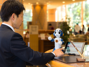 「働き方を、受付から変える。」をコンセプトに、卓上型の小型ロボット「Sota(ソータ)」がスタッフの代わりに来訪者の初動対応を行います。