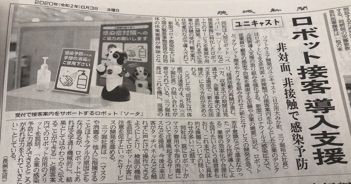2020年6月3日付茨城新聞にて、ロボットによる非対面・非接触での接客案内を中心とした企業のデジタル技術導入支援の取り組みについて掲載いただきました。