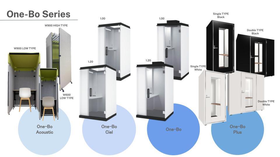 「One-Bo」は、オンライン会議が当たり前になったことにより生まれた3つの新たな問題(イヤホンボイス公害・会議室難民・リモート漏洩)を解決するために、Zoomと共同企画をしたパーソナル・ミーティング・ボックスです。消防申請が不要の「One-Bo Ciel」、高性能で高吸音の「One-Bo Plus Single TYPE」、レイアウト自由で高吸音の「One-Bo Acoustic」、複数人で参加できる「One-Bo Plus Double TYPE」など、様々なラインナップをそろえています。