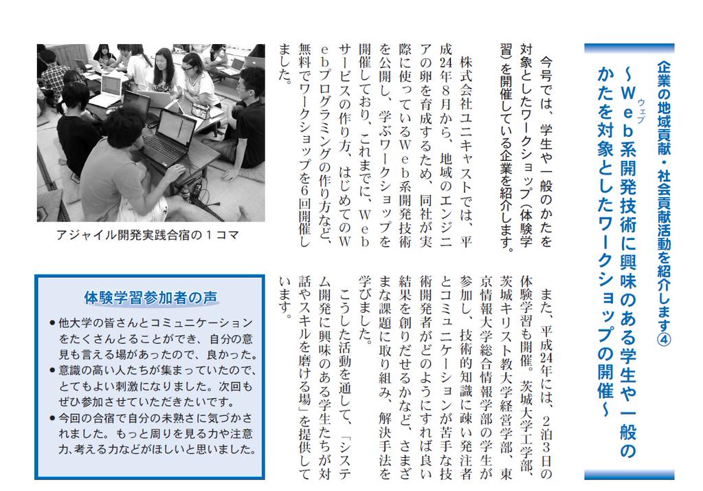 日立市報2月20日号に掲載していただきました。 2015.02.26 トピックス 平成27年2月20日号の日立市報に弊社のワークショップ活動を取り上げていただきました。 平成24年9月6日(木)~8日(土)に2泊3日で開催した、「アカデミックブートキャンプ2012 〜アジャイル開発実践合宿〜」についても紹介されています。 3大学から多くの学生にご参加いただき、とても有意義なワークショップとなりました。 今後も学生たちの学びの場として様々なワークショップを開催していきたいと思います。 掲載ページはコチラ 次の記事へ 前の記事へ 一覧に戻る
