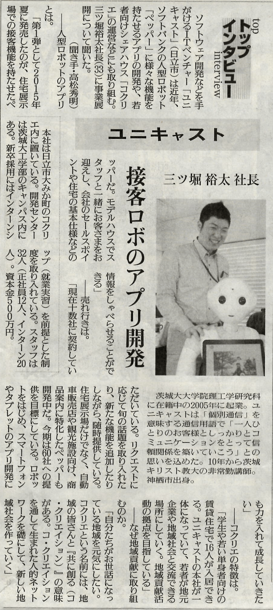 2016年1月31日(日)の読売新聞にて、「ロボアプリ開発」「シェアハウス事業」について、掲載していただきました。