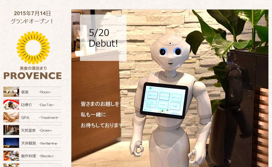 株式会社モアレリゾートが運営する三重県志摩市のホテル「美食の湯泊まり プロヴァンス」は、三橋弘喜社長の「新しいことをどんどん取り入れて、志摩の素晴らしさを発信していきたい」という思いから、2016年5月にPepperを導入しました。Pepperは先進的な印象を強く与えるコンシェルジュとして、お客様をおもてなししています。