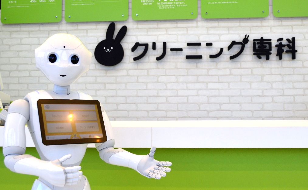店舗に入るとPepperがお出迎え。クリーニングに衣類を出す際の注意点や豆知識を説明します。