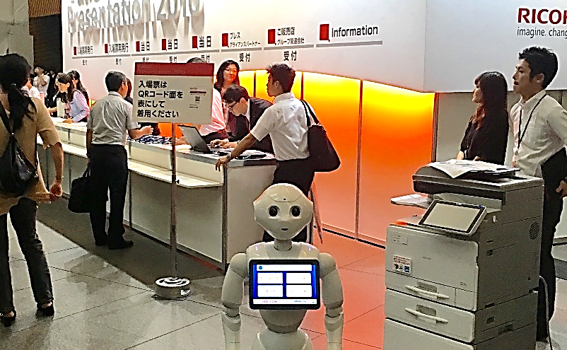 リコーグループ最大の展示会「Value Presentation 2016」にてお披露目。Pepperがイベントやセミナーの案内、展示場マップを来場者に印刷してご案内しました。
