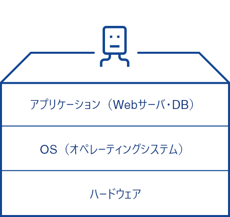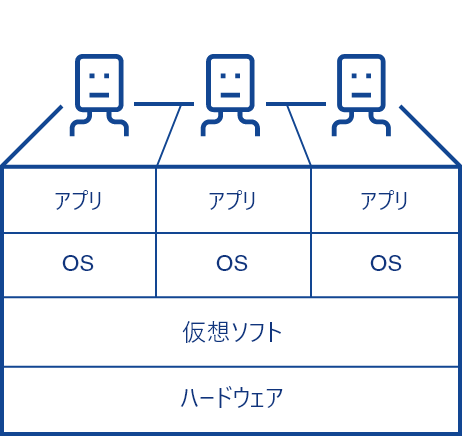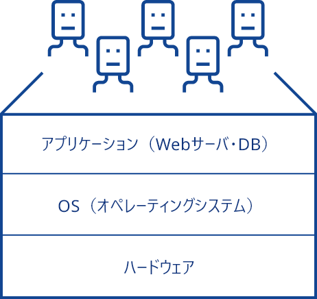 仮想化技術を使い1台の物理サーバ上に複数のお客様が独立した領域を構築します。アパート、マンションのイメージです。
